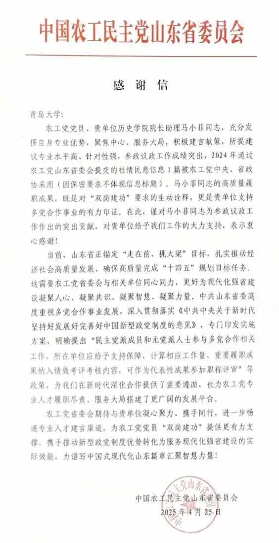 感谢信中指出,农工党党员马小菲同志,充分发挥自身专业优势,聚焦中心、服务大局,积极建言献策,所提建议专业水平高、针对性强,参政议政工作成绩突出,2024年通过农工党山东省委会提交的社情民意信息1篇被农工党中央、省政协采用(因保密要求不体现信息标题)。马小菲同志的高质量履职成果,既是对“双岗建功”要求的生动诠释,更是学校、学院支持多党合作事业的有力印证。