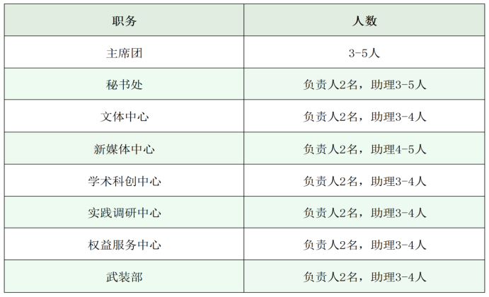 学生会采用“主席团+工作部门”的模式,目前共设有主席团与七个不同的学生职能单位:秘书处、文体中心、新媒体中心、学术科创中心、实践调研中心、权益服务中心与武装部。根据实际工作需要,本次职务设置如下: